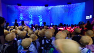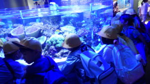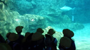 水族館には、大きなイルカやシャチ、ウミガメ、ペンギン、色とりどりの魚たちがいました。子どもたちはしっかり観察し、気づいたことをメモしていました。