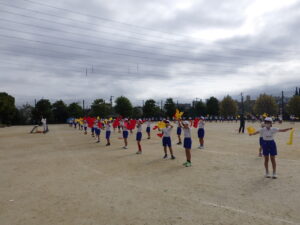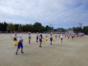 運動会に向けてフラッグダンスを頑張っています。完成に向けて、ウェーブや写真隊形の練習をしました。息の合ったフラッグダンスを見ていただけるように、入場から退場まで確認しながら進めました。次は、総練習で全校に披露します。運動会当日まで、あと10日程。笑顔で曲にのって表現する姿をご覧ください。