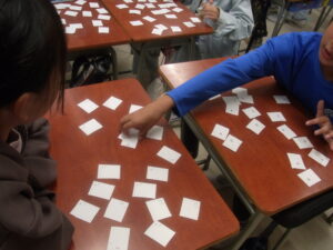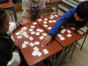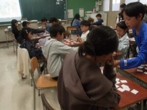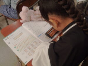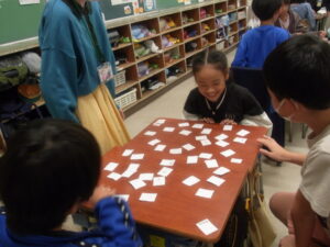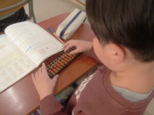 運動会が終わり、気温も比較的穏やかになり、過ごしやすい季節になりました。外国語活動では、エミリー先生と一緒にABCカードで神経衰弱をしたり、ABCソングを歌ったりしました。次は、自分の名前をアルファベットで書くことにチャレンジします。算数科では、「そろばん」に取り組んでいます。いろいろな活動を楽しみ、積極的に授業に参加をしています。