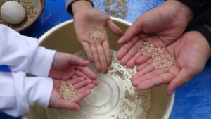 もみすりでは時間を掛けて丁寧に作業をしました。自分たちの手でお米のもみがとれ、見慣れた形になっていくことが嬉しかったようです。