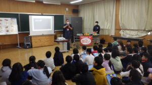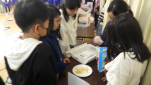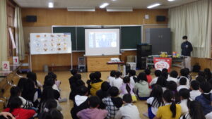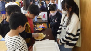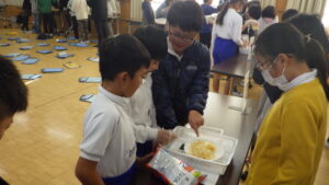 10日(月)にカルビーによる出前授業がありました。2時間目は、事前に行ったアンケート結果の発表がありました。学戸小学校4年生の普段食べるおやつベスト3!!3位はグミ。2位はアイスクリーム 1位は、スナック菓子でした。また、1日に必要なカロリーやおやつの量について知りました。おやつに食べるポテトチップスの量をグループごとに量り、1日には35gがベストだということを学びました。ついつい、ジュースを飲みながら多くおやつを食べすぎてしまっているという意見も出て、おやつの目安量を見直すきっかけになりました。3時間目は、ポテトチップスができるまでの過程をビデオで鑑賞しました。また、パッケージの見方や消費期限や賞味期限についても学びました。
