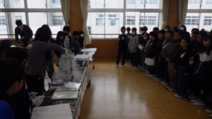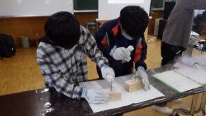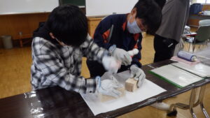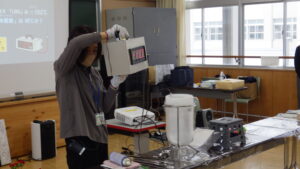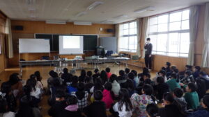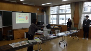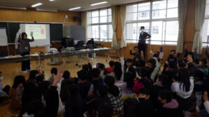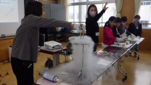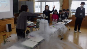 本日は東邦ガスの方に出前授業をしに来ていただきました。二酸化炭素やフロンなど、地球温暖化が起こる原因となる温室効果ガスについてや化石燃料を使った発電に代わる発電方法について教えていただきました。液体窒素を使った実験では、クラスの代表児童がカチカチに凍ったタオルを使って釘打ちをする姿や、凍った花を触る姿に、みんな目を輝かせて見入っていました。東邦ガスの皆様、ありがとうございました。
