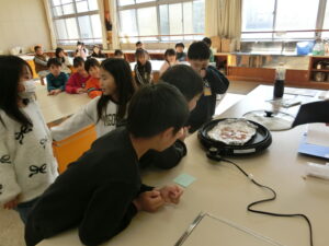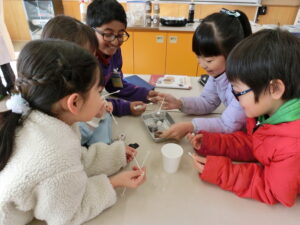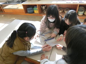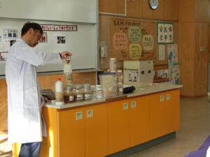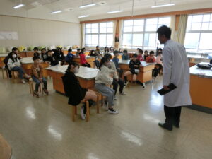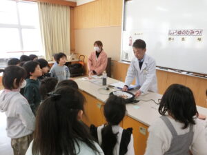 1月21日(水) 醤油もの知り博士による出前授業がありました。最初は醤油が焦げた匂いを嗅いで、「どんな食べ物をイメージするか」の問いから授業がスタートしました。醤油の香ばしい匂いを嗅ぎながら授業は進み、醤油の原材料や作り方について学びました。また、醤油の原材料である大豆や小麦、塩、麹菌も実際に見ることができました。授業の最後では、「もろみ」「しぼりたての醤油」「店で売られている醤油」の3種類の醤油の味見をしました。子どもたちは口々に感想を言いながら興味深く味見をし、楽しく授業を終えることができました。