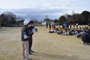 本日の昼放課に「予告なしの避難訓練」を実施しました。たくさんの児童が遊んでいた運動場に地震を知らせる放送が流れると、ざわめきが起こったあと、子どもたちは運動場の中心当たりに集まってしゃがみ始めました。ろう下にいた 低学年の子たちは、上級生の避難の様子を見て、同じように安全な場所で座ったり、低い姿勢をとったりしていました。