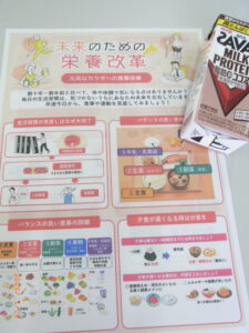 本校職員とPTA役員の方が参加し、第2回学校保健委員会が開催されました。まず養護教諭から健康診断の結果や保健室来室状況、欠席状況など本校の実態について報告がありました。次に明治乳業の講師の方から、「未来のための栄養改革」について講話をしていただきました。毎日の生活習慣は気づかないうちに未来を左右しています。病気のリスクを減らすためにもバランスの良い食事を心がけ、食事の内容を工夫できるようなアドバイスをいただきました。中でも、タンパク質やカルシウムを多く摂取できる食品や減塩の仕方、タンパク質の摂取量をアップする方法を教えていただきました。明治の皆様、ありがとうございました。