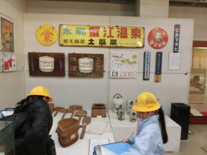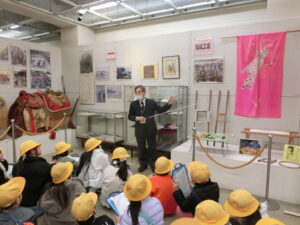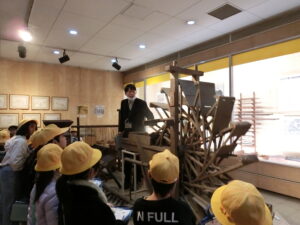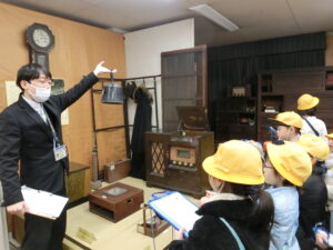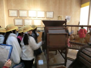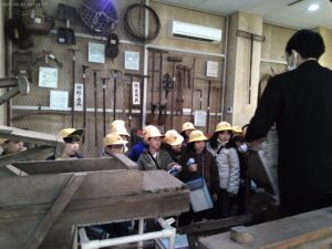 1月29日(木)、小雪が舞う中、寒さにも寒さにも負けず、歴史民俗資料館へ見学に行ってきました。資料館では、解説員さんの説明を聞きながら、蟹江町の歴史や文化、昔の生活や道具について学びました。特に昔の道具の部屋では、唐箕や水車などの農機具、見たこともない昔の五つ玉そろばんなどに触れることができました。子どもたちは、昔の道具と今の道具の違いに驚いたり、昔の人々の生活がとても大変だったことを感じとったりすることができました。蟹江町の歴史や文化に触れ、蟹江町の良いところをたくさん学び、郷土愛がますます湧いてきたようでした。