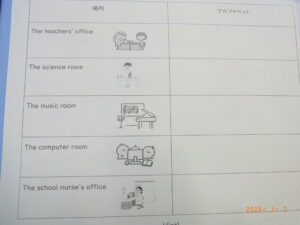 外国語の時間に、英語を使用し、校内を案内する活動をしました。教室を出発し、「Go straight」や「Turn left/right」と英語で言いながら進みました。目指すは、5つの特別教室です。保健室・音楽室・理科室・職員室・ICT教室にアルファベットが貼ってあり、その文字を組み合わせて一つの言葉を完成させました。英語だけで一生懸命ペアの友達に道を伝え、案内をする姿が見られました。